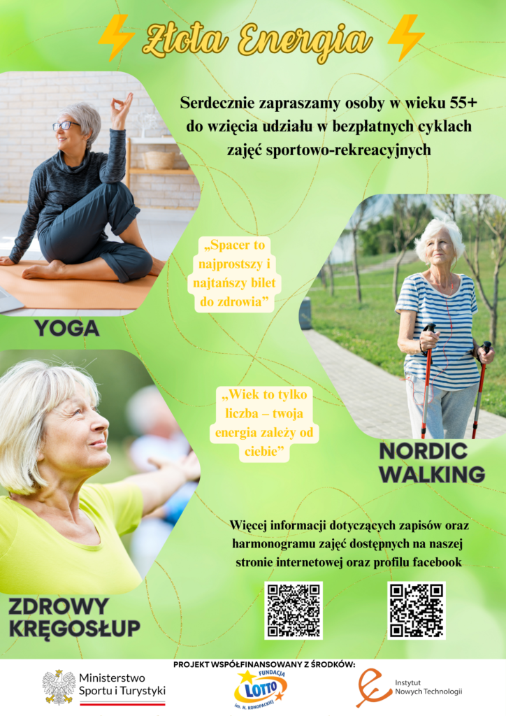 Projekt ,,Złota Energia” skierowany był do osób w wieku 55+, którzy chcieli zadbać o swoje zdrowie poprzez udział w zajęciach sportowych. Zajęcia odbywały się w różnych miejscach w Łodzi oraz Pabianicach.