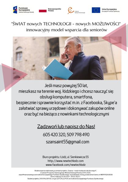 W dniach 24.05, 26.05, 28.05., w godzinach 10-14 w Instytucie, przy ul. Sienkiewicza 55, po uprzednim umówieniu się telefonicznym lub mailowym, osoba zainteresowana projektem będzie mogła uzyskać niezbędne informacje od koordynatora projektu. Na stronie Stowarzyszenia oraz w mediach społecznościowych znajdują się szczegółowe informacje o projekcie http://www.newtechlodz.com/projekty/seniorzy/szansa/
